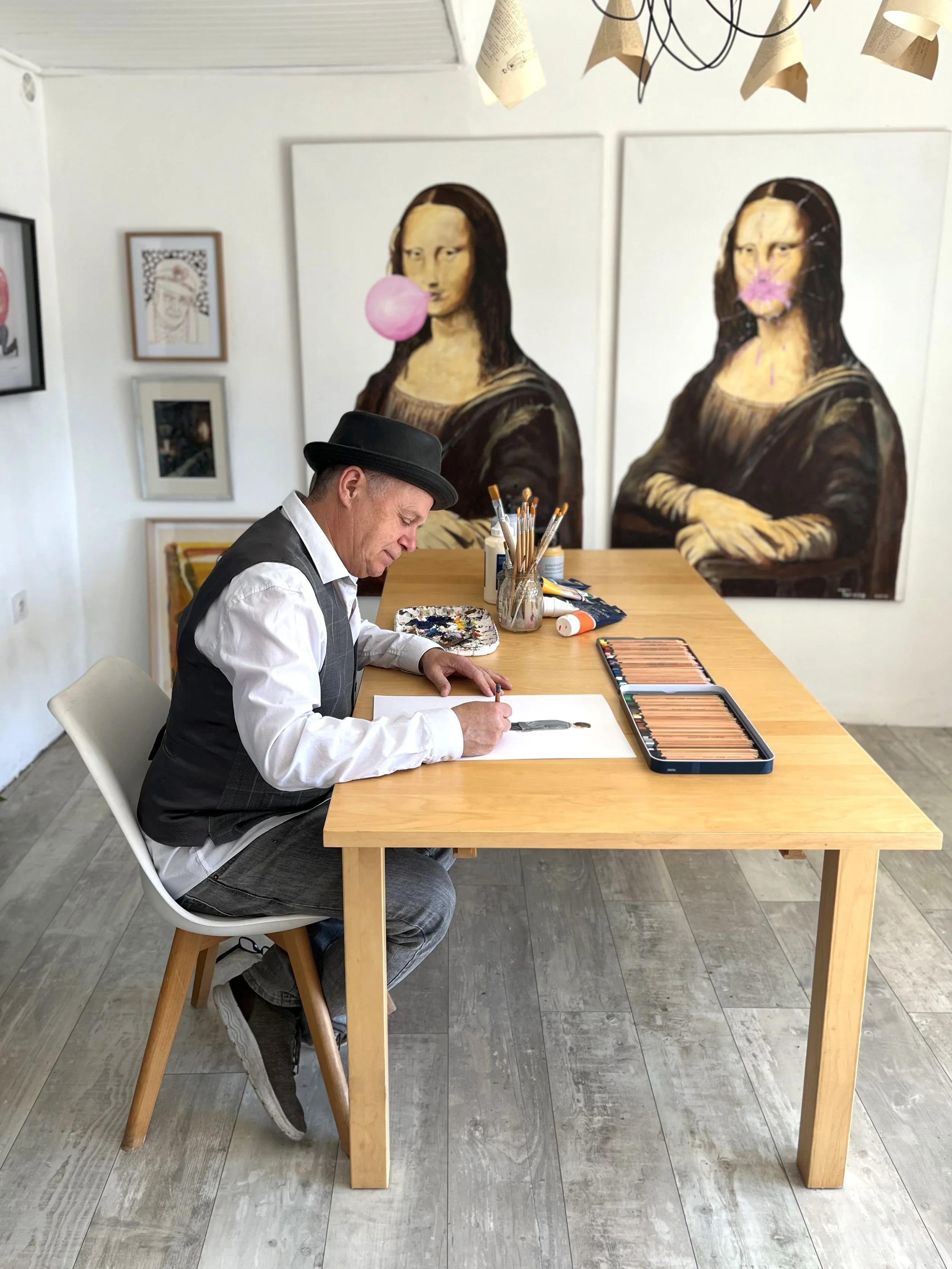 Dans ma dernière série de peintures, dessins et sculptures inspirées de mes tableaux, j’explore la figure de l’homme contemporain, cet être pensif, suspendu entre lassitude et désir d’évasion. Mes personnages semblent rêver d’un horizon situé au-delà de l’ordinaire, d’un territoire mental qui leur permettrait d’échapper au poids écrasant du quotidien, de la malbouffe, des automatismes, et des routines qui anesthésient leur élan vital.